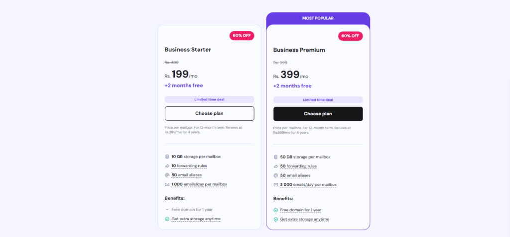 Hostinger’s Business Email plans start at $0.99/month, offering enhanced storage, spam protection, and additional aliases. It’s perfect for growing teams and organizations needing a secure, professional communication platform.